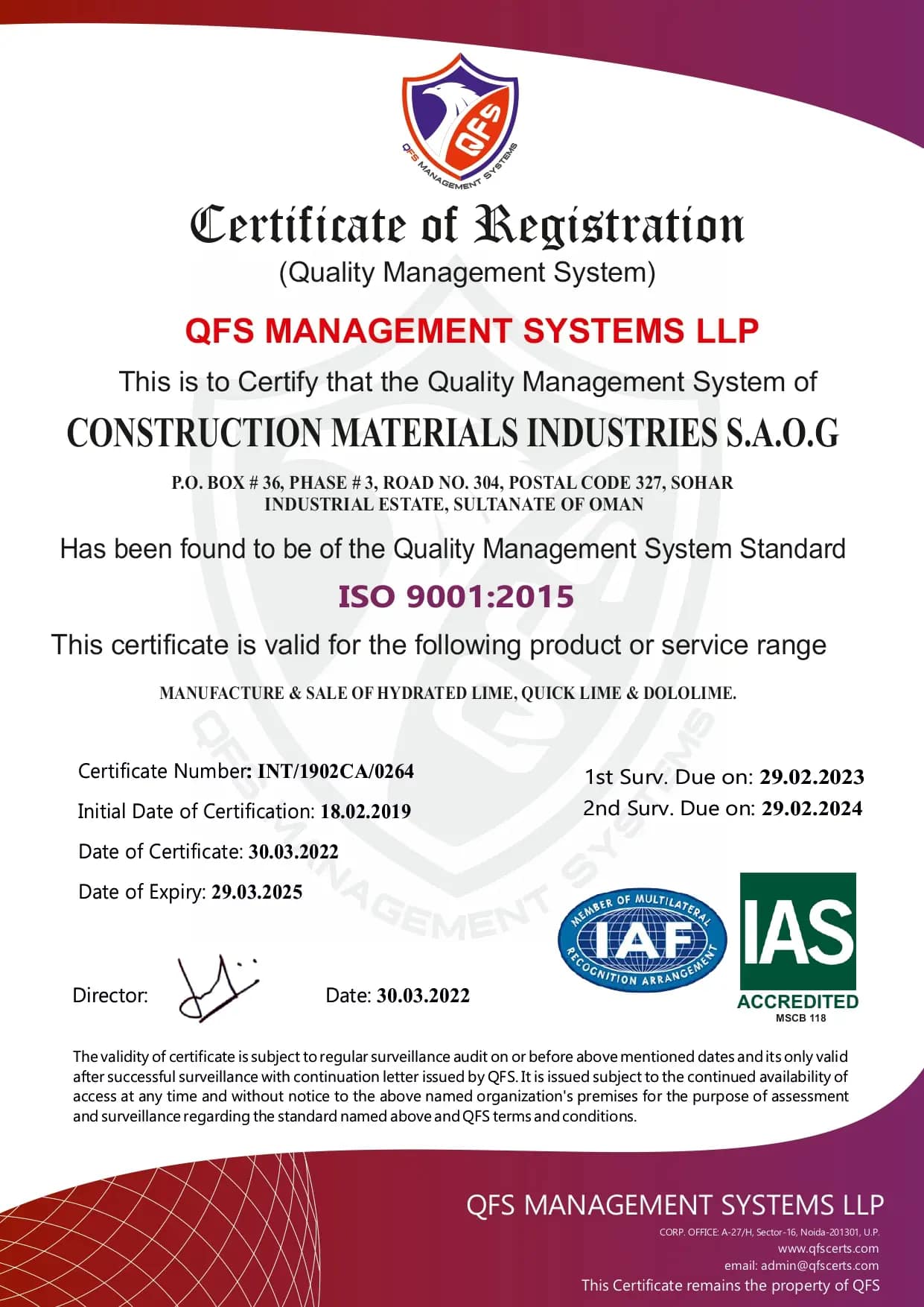 شركة صناعات شركة صناعة مواد البناء ش.م.ع.ع (CMI) شهادة الأيزو 9001:2015 المرموقة لتصنيع وبيع الجير المطفأ والجير السريع. وتسلط هذه الشهادة المرموقة الضوء على التزامنا الراسخ بأعلى معايير الجودة في عمليات الإنتاج وتفانينا في تقديم منتجات الجير المتفوقة للعملاء في جميع أنحاء العالم.
